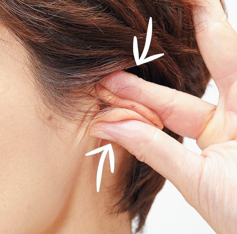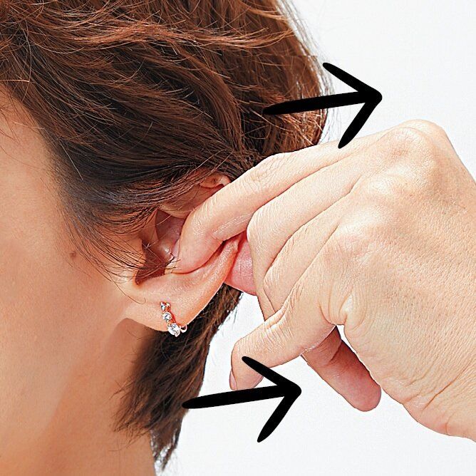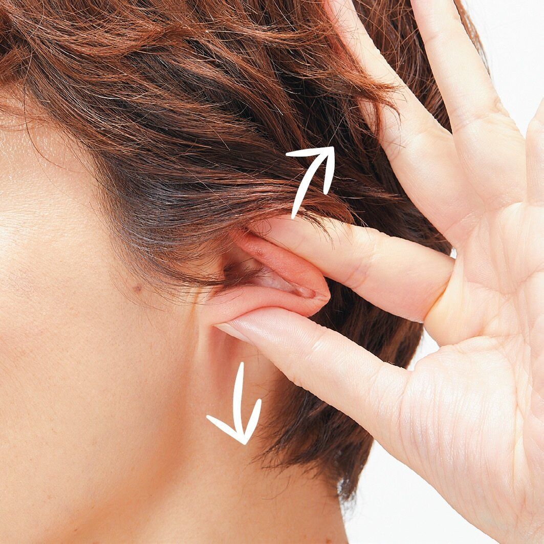 耳を親指と人差し指で上下からペタンとつぶすようにはさんだら、離す。これを耳がほぐれるまで繰り返す。左右同じようにやる。