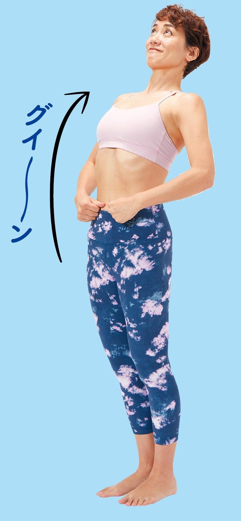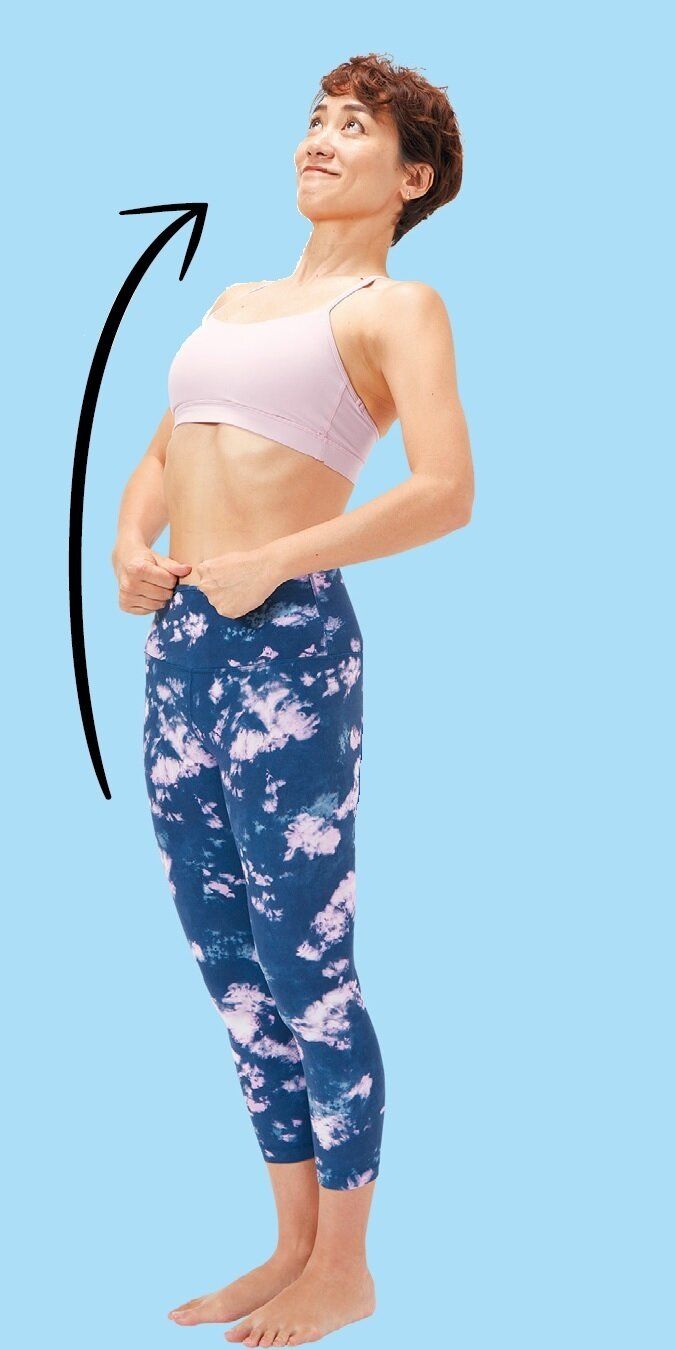 みぞおちからおへその距離を離すイメージで、胸を天井に向けながら、つまんだお肉が手からはずれるまで伸ばす。あごは上を向かないように引いて。