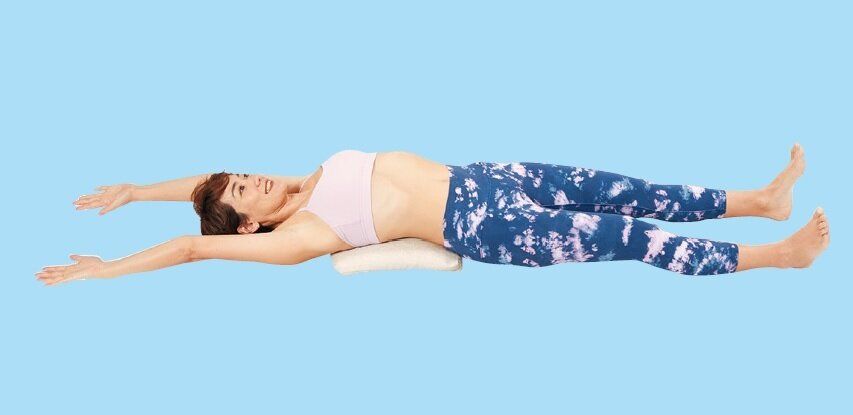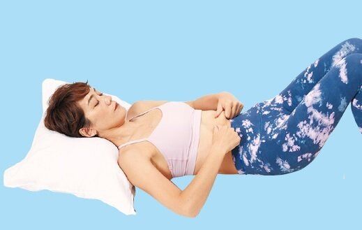 あおむけでひざを立て、みぞおちのお肉を両手でつまんでぷるぷる1分間揺らす。