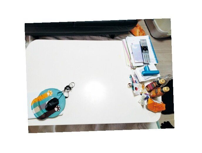 子どもたちが帰宅後パソコンや勉強ノートをテーブルに置いて朝まで放置。端に寄せて片づけても作業場所が足りず、結局床に置くことに(涙)。