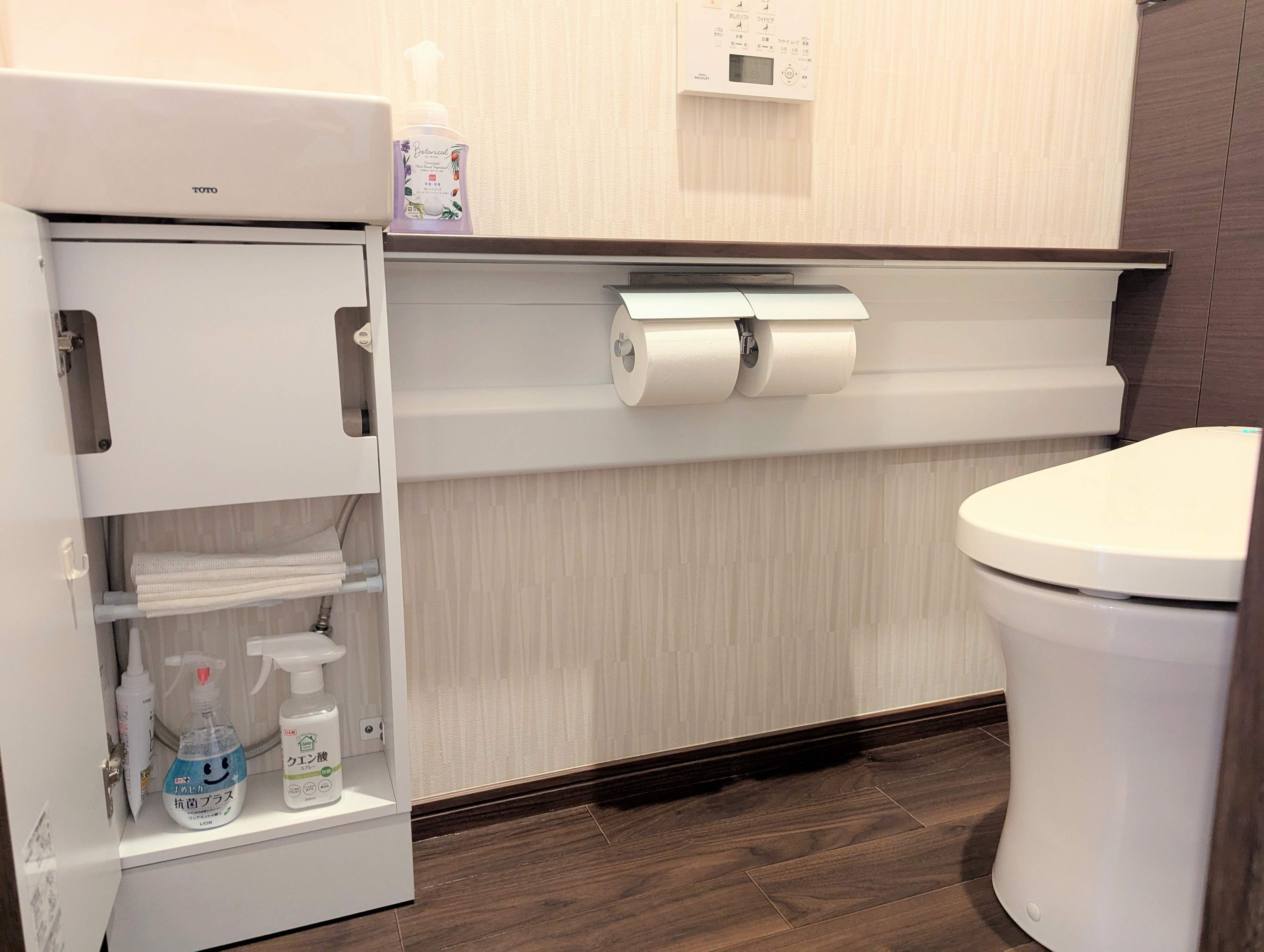 掃除道具は、朝のぼんやりした頭でも迷わず手に取れる配置が◎。我が家では、取り出しやすい手洗い器下にまとめて収納しています。