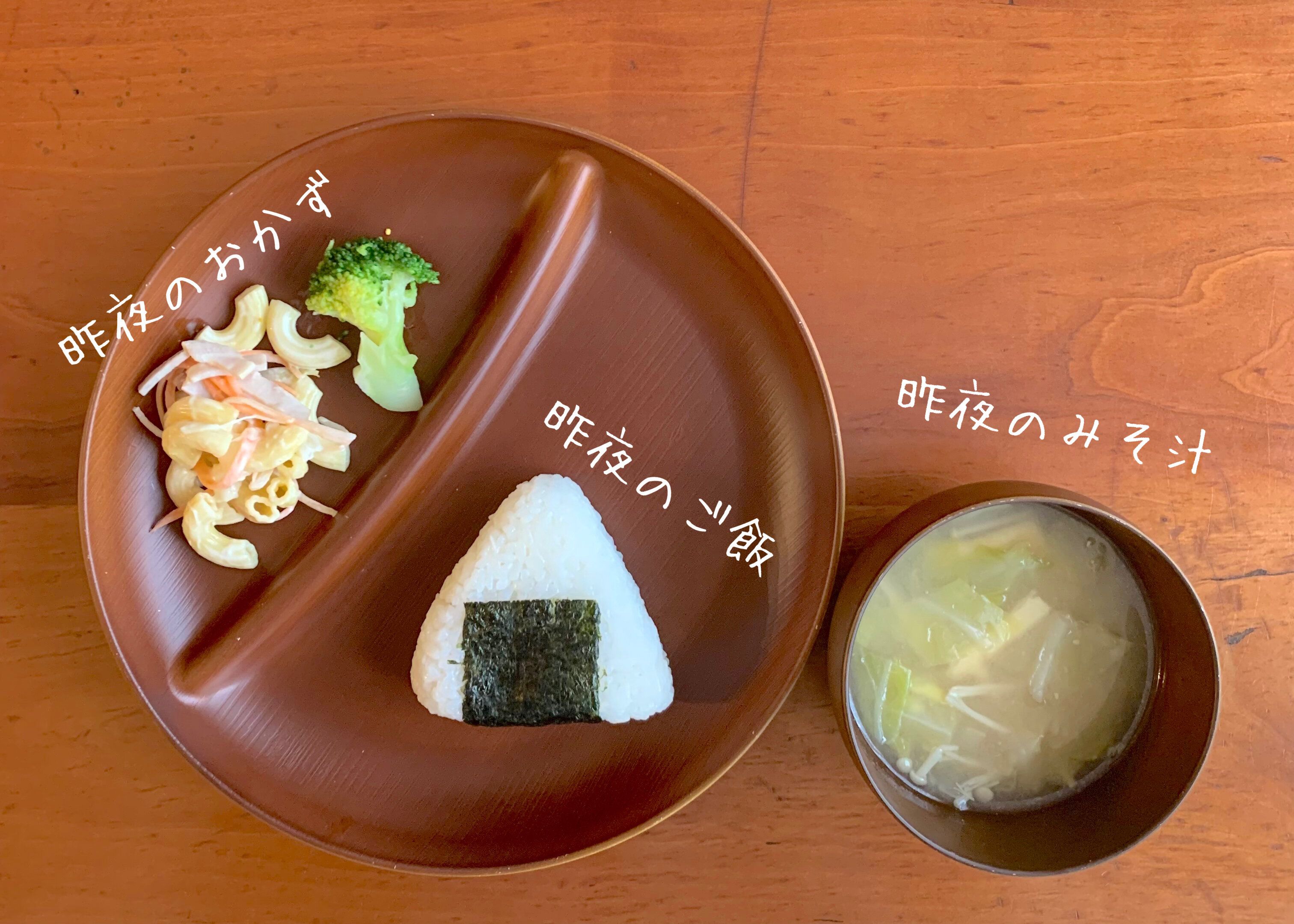 例えば、上の写真の朝食は、前日の夕食のみそ汁とおかず、そして余ったご飯に適当に具を入れたおにぎりです。夜のうちにおにぎりを作っておけば、朝はみそ汁やおかずと一緒に温めるだけで、すぐに朝食を用意できます。