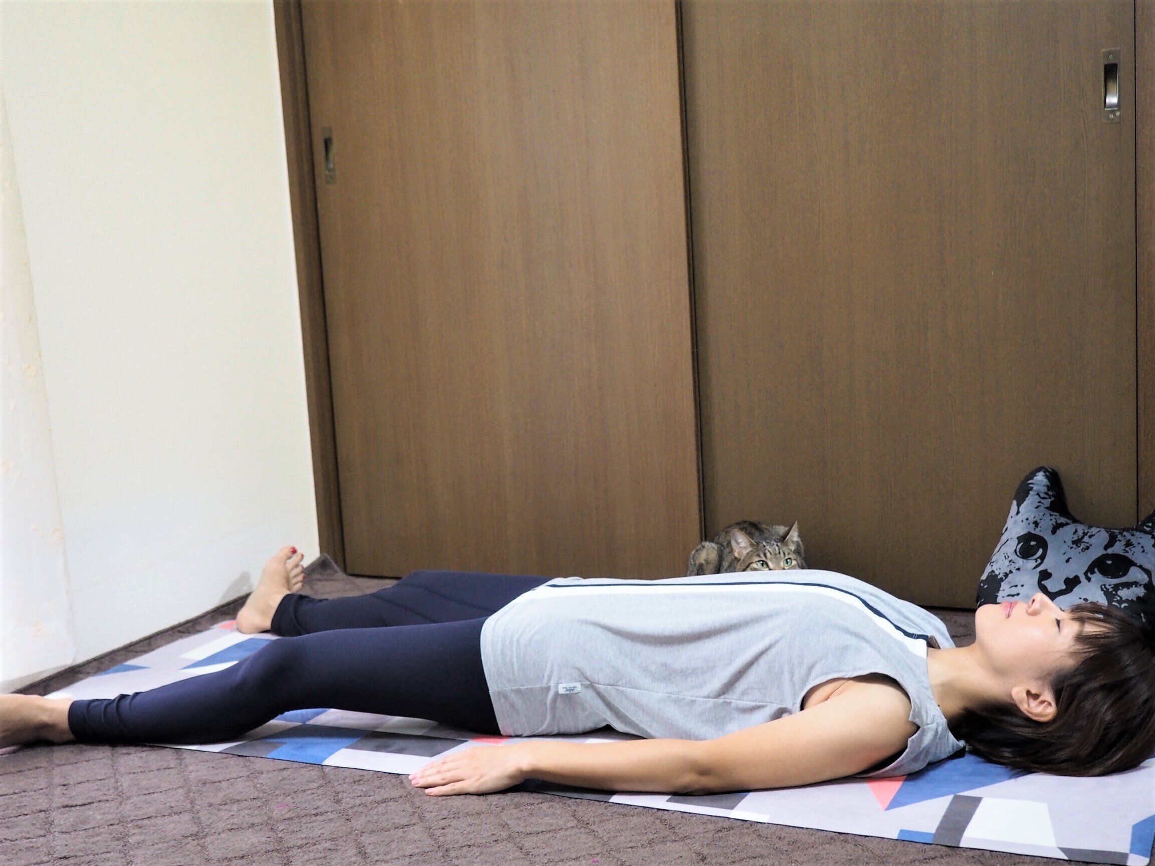 仰向けになり、骨盤が上がっている方のひざを曲げて伸ばします~5呼吸
