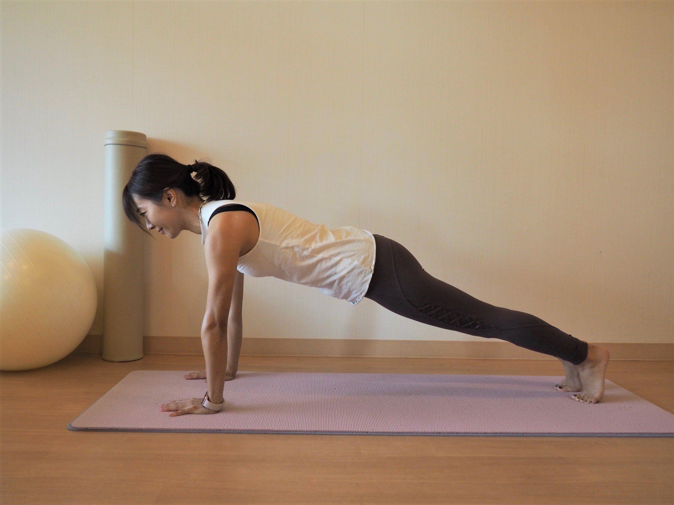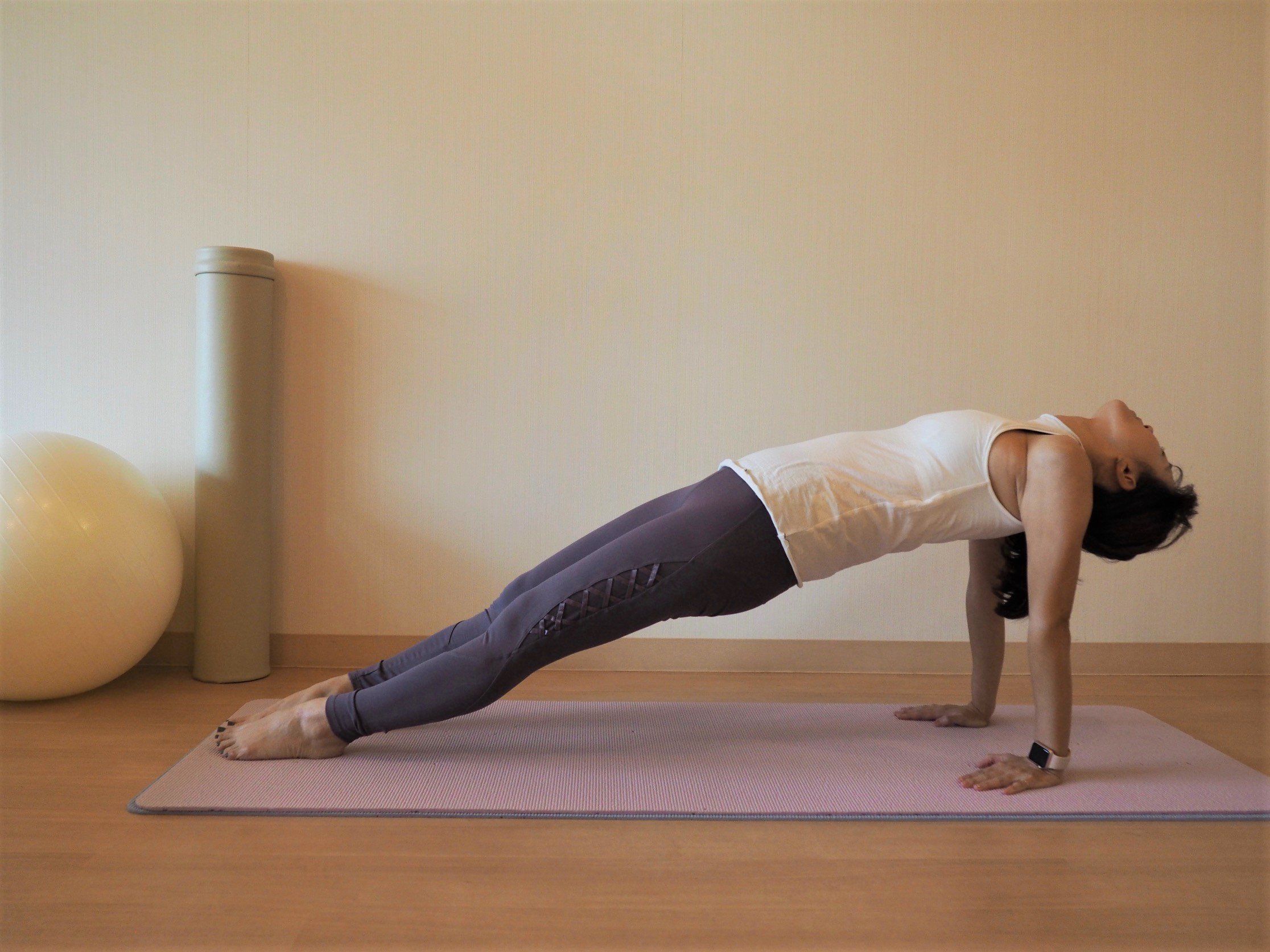 ヨガでは、「東側を強く伸ばすポーズ」と呼ばれている腕や体幹、背中、お尻の筋力強化に期待できるポーズです。