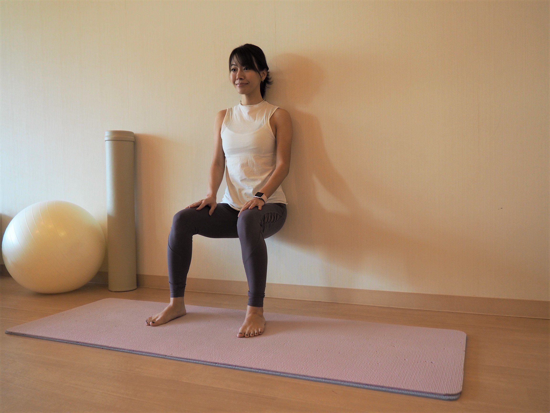 足全体と背骨の強化に期待できる「空気椅子」は、両方の肩を壁につけることで胸を開く感覚を取り戻せて、姿勢の改善にもなりますよ。