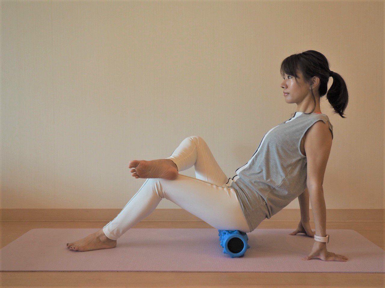 そんな日は、伸ばすと気持ちよく感じる部分をグーッとストレッチしてあげたり、次の写真のようなヨガポール(フォームローラー)やテニスボールのような硬さのあるものを使って体重をかけてほぐしてあげることでも血流がよくなって代謝量の増加が見込めると言われています。