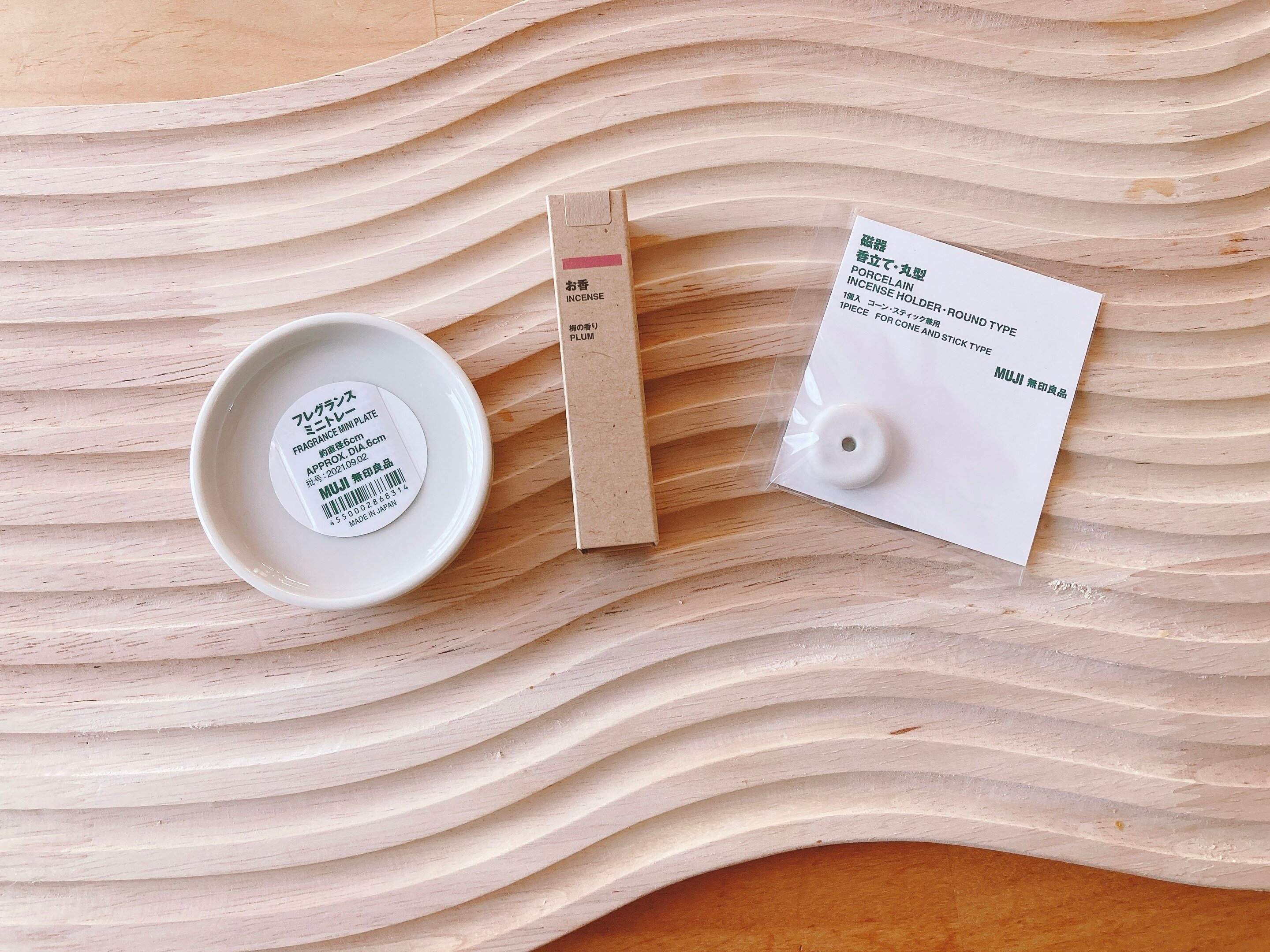 無印良品で購入したお香立ては190円、トレーは390円、お香は12本入りで390円なので気軽に始められる「ぜいたく」時間です。
