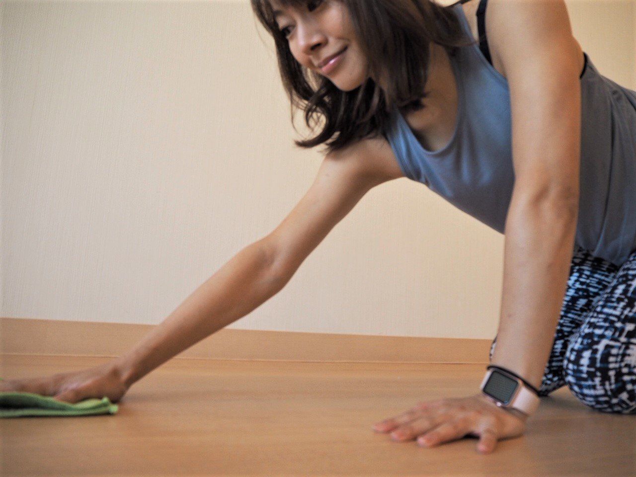 掃除機やモップでの掃除と比べて、細かなところまで丁寧に拭き掃除ができてそのうえ二の腕も引き締まるなんて一石二鳥ではありませんか?