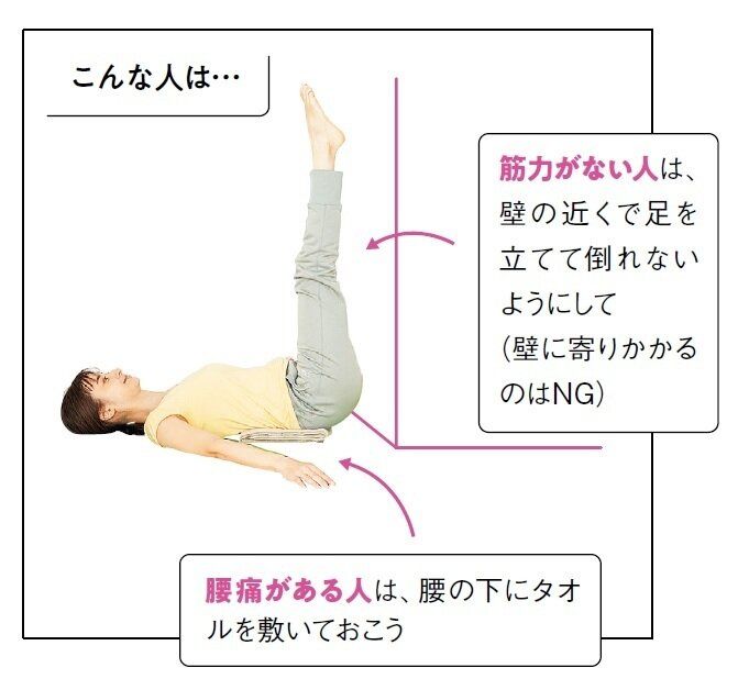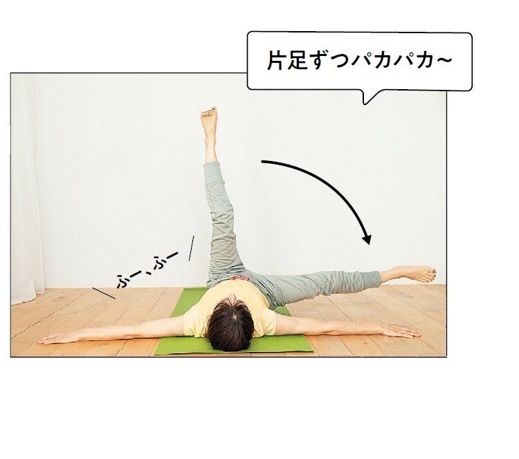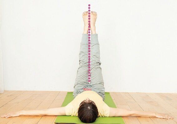 背中からお尻をしっかり床にくっつけて、なるべく足を垂直に上げること!ひざが胸に近づきすぎると効果はダウンするよ。