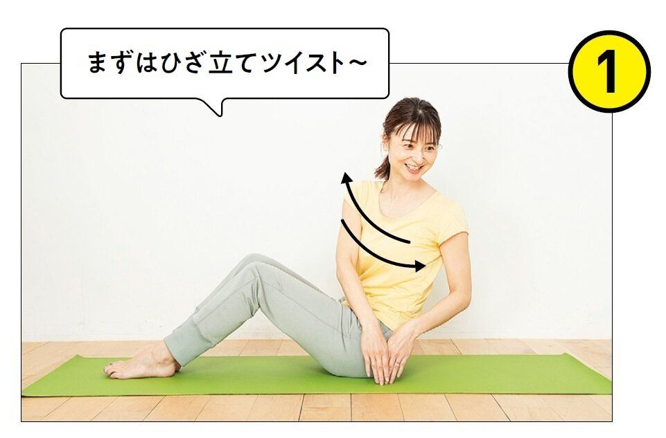 床に座ってひざを立て、体をひねって手を床にタッチ。左右交互にひねる。