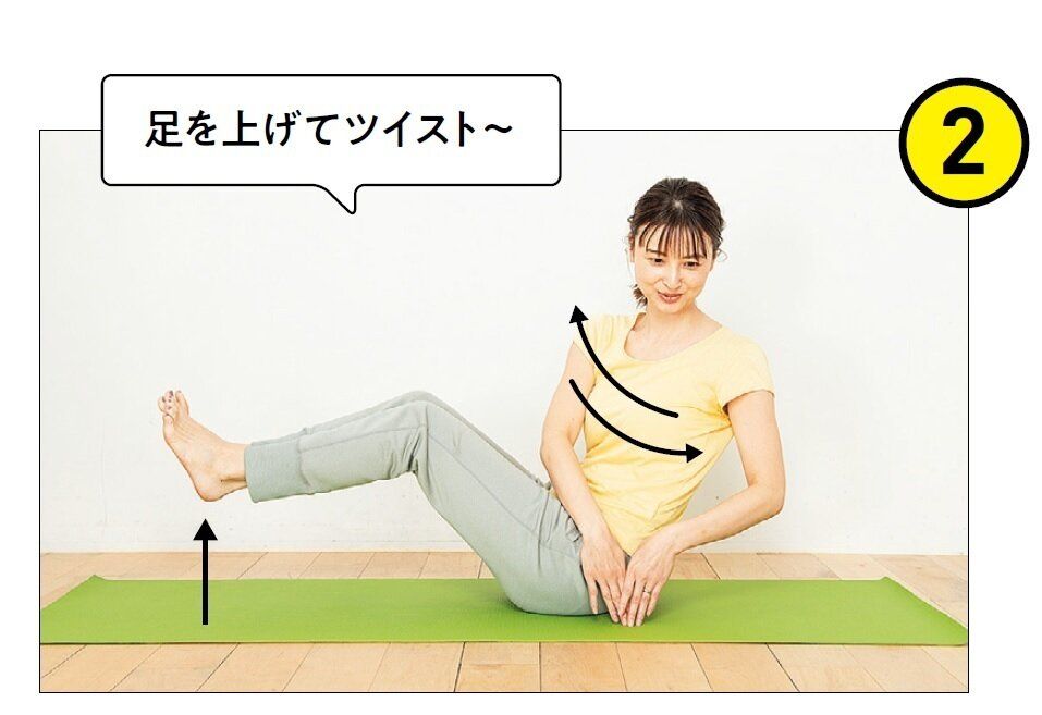 両足をそろえ、すねを床と平行にして足を上げ、体を左右にひねる。