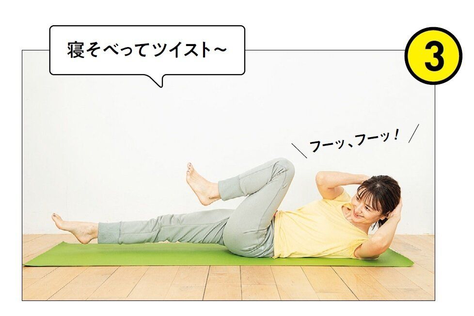 寝そべって、頭に手を当て、足を胸に寄せて反対側のひじでタッチ。左右交互にひねる。