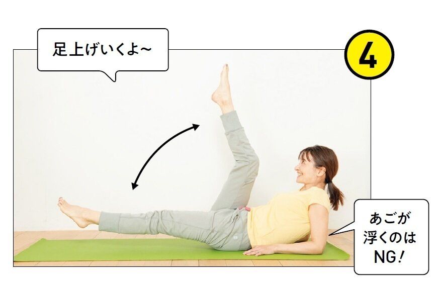 ひじで体を支えながら、足を交互に上げる(あごが上がらないように注意)。