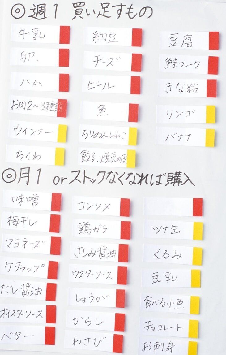 毎回買う物、使い慣れた食材を付箋に記入。「定番食材を”見える化”したら、献立を考えるのがラクになり、ムダな使い残しもなくなりました」。