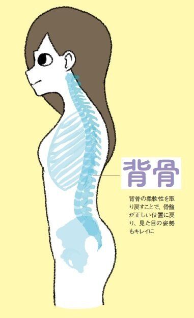 首からお尻にかけてS字カーブを描いている背骨は、きれいな姿勢を保つための要。固まっている背骨がスムーズに動くようになれば、腹筋をきちんと使えるようになり、反り腰&猫背が改善。ぽっこりおなかもスッキリします。