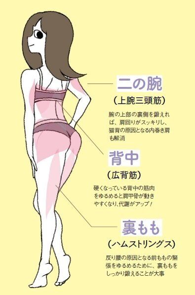 - 二の腕、背中、裏ももの「やせ筋」を鍛えると、メリハリボディに!