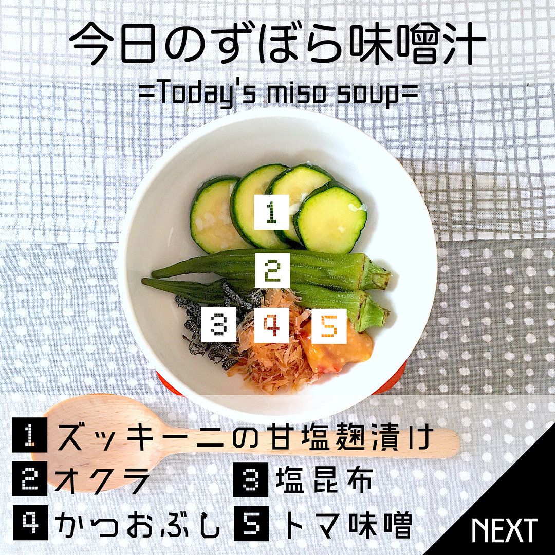 大好きな揚げ物やお肉を我慢せずに食べているhasegawaromiさんは、普段のご飯で調整するようにしています。この日はトマトを使った合わせ調味料「トマ味噌」、かつおぶしと塩昆布、ズッキーニの甘塩麹漬け、オクラ、ねぎを味噌汁にしました。オクラは腸内細菌のエサになる水溶性食物繊維が豊富なので、便秘解消に効果的なのだとか。