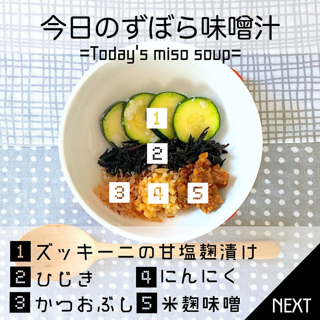 この日は味噌汁の具材に、ズッキーニの甘塩麹漬け、ひじき、にんにくを使用したhasegawaromiさん。海藻類であるひじきには、腸の働きを促し腸内環境を整える、食物繊維やマグネシウムが豊富に含まれているそうです。乾燥ひじきは、長期保存しやすく味にくせがないので、煮物やサラダなどさまざまな料理に活用できて便利ですよ。