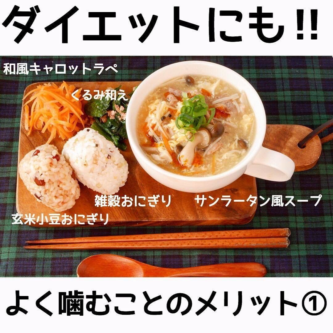 kana_nrdさんによると、「よく噛む」ことには満腹中枢を刺激して食べ過ぎを防ぐ、消化吸収しやすくなる、代謝や脂肪燃焼の促進、ストレスの解消といった効果が期待できるとのこと。そのため、野菜を大きめに切って歯ごたえを残す、ご飯に黒米や麦を混ぜる、ナッツをトッピングするなど、食事にもよく噛める工夫を取り入れています。
