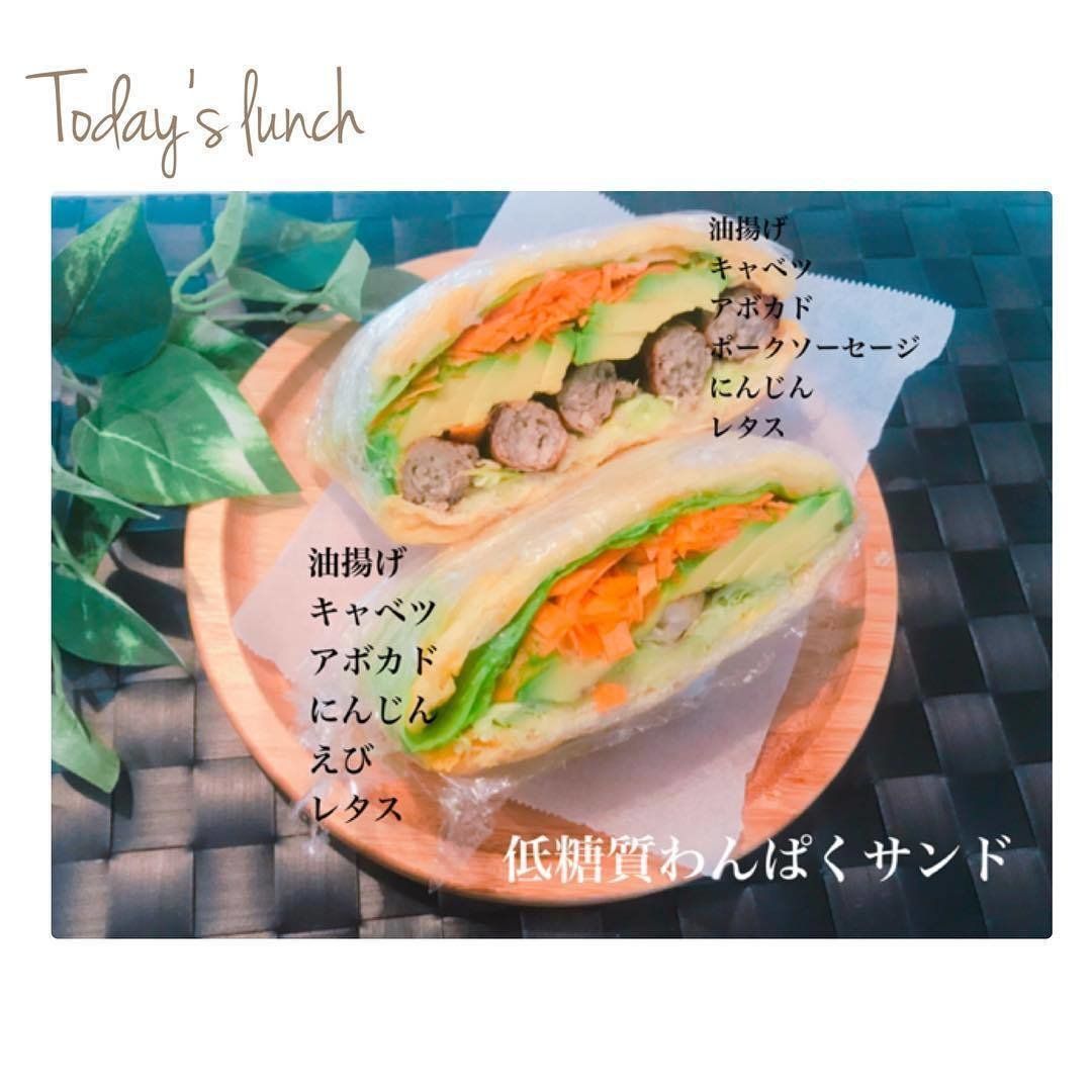こちらは、パンが大好きな155_dtmeshiさんが作った「低糖質わんぱくサンド」。パンの代わりにカリカリに焼いた油揚げを使い、キャベツ、にんじん、アボカド、レタス、ソーセージ、えびなどの具材をたっぷり挟んでいます。油揚げにチーズをのせて焼くと、液だれ防止にもなるそうですよ。