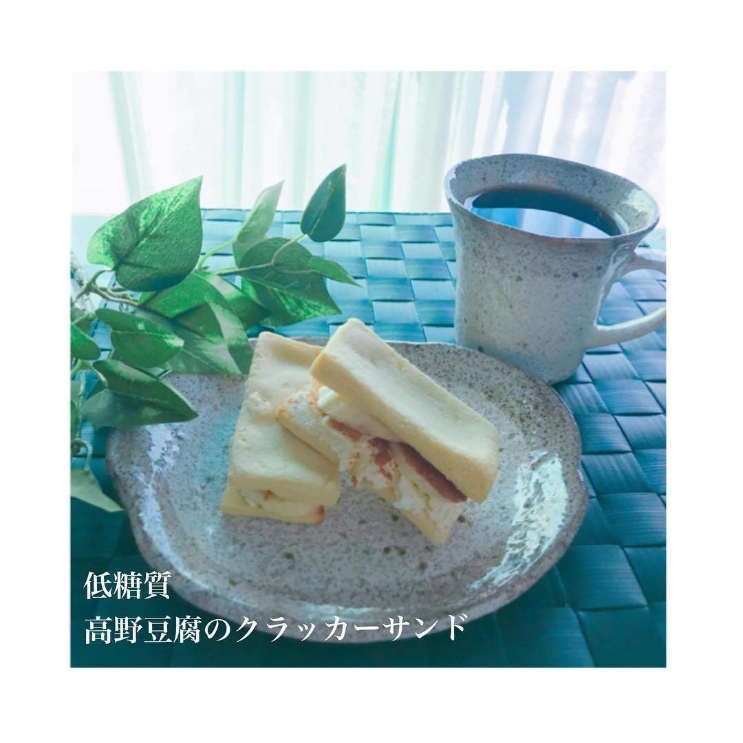 ダイエット食材として「高野豆腐」を活用している155_dtmeshiさん。こちらの「クラッカーサンド」は、水で戻した高野豆腐をスライスして水気を絞り、トースターで焼いてバナナ・クリームチーズと・シナモンを挟んだもの。高野豆腐は栄養満点で、胃で膨らむのでダイエットにもオススメとのことです♪