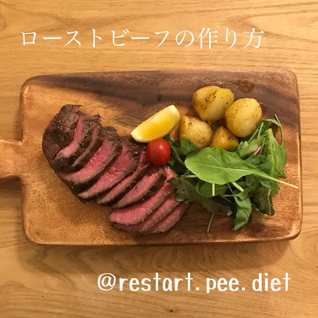 お休みの日にはゆっくりと肉料理を作ることもあるrestart.pee.dietさん。この日はローストビーフ作りに挑戦!中火でお肉の全部の面を2分ずつ焼いたら、ふたをして弱火で5分焼き、あとはアルミホイルに包んで粗熱が取れるまで放置。出てきた肉汁を捨てたら完成です。タンパク質も豊富でおいしそうですね♪