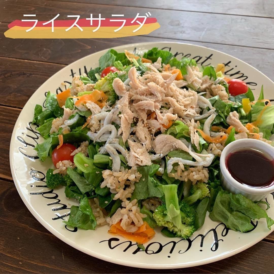 野菜とたんぱく質と糖質を一品でとれるライスサラダです。つくり方は、お好みの野菜と米を混ぜ、肉や魚などお好みのトッピングをのせてドレッシングをかけるだけ。野菜をチョップドサラダのように刻むと、米と混ざりやすくなり、食感もよくなるのだとか。ドレッシングは梅酢・麺つゆ・ごま油を混ぜた梅ダレがイチオシです。