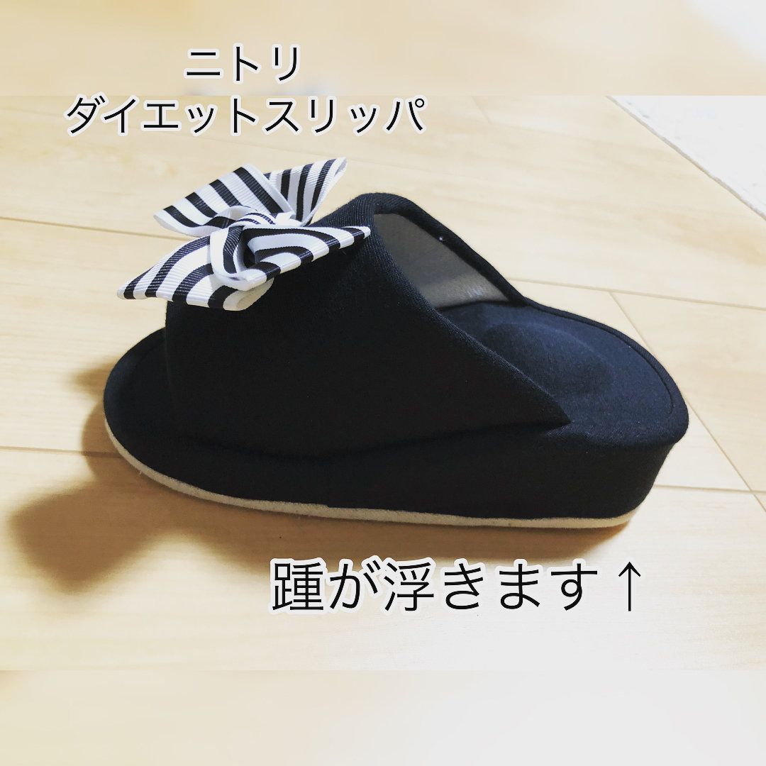 家の中では、ニトリのダイエットスリッパを履くようにしています。なんと、すでに3足もリピ買い中!履くと自然にかかとが浮いた状態になり、姿勢がよくなる効果も期待できるとのこと。555円というコスパのよさもうれしいですね。