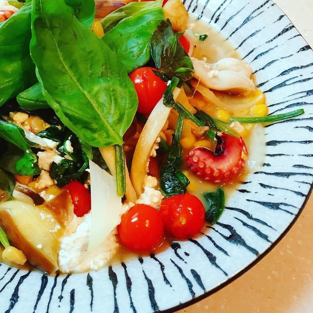 野菜たっぷりで彩りも豊かな糖質制限メニュー。ナスを乱切り、タコをぶつ切り、エリンギを縦切り、ほうれん草を食べやすい大きさに切り、フライパンで炒めてガーリックソルトを振ります。最後に洗ったプチトマトとカッテージチーズを加え、スイートバジルを乗せたら完成!バターの代わりにカロリー・脂肪分オフのスプレッドを使用しています。