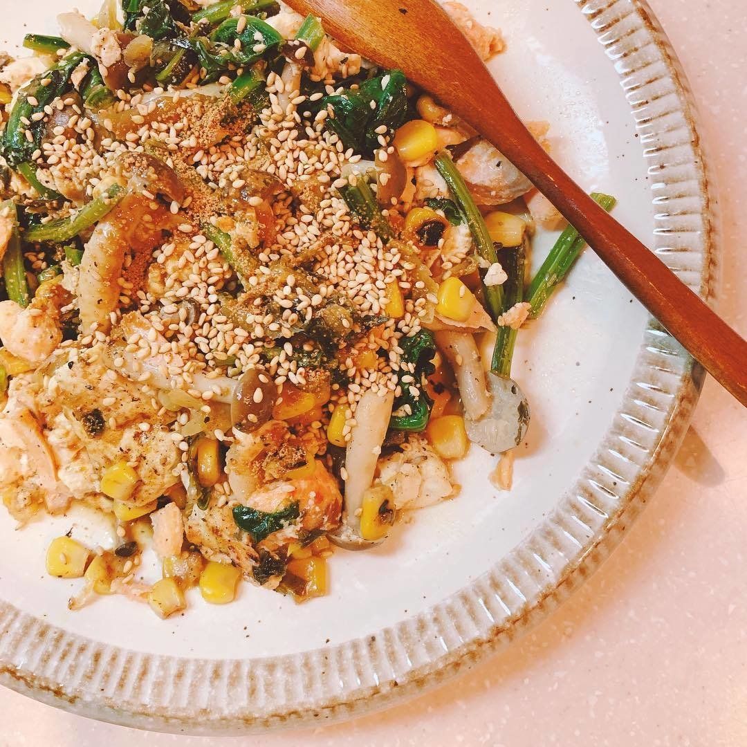 鮭は焼いて身をほぐし、豆腐はキッチンペーパーで巻いて電子レンジで3分加熱。フライパンでコーンをマヨネーズ・コショウで炒め、食べやすく切ったほうれん草としめじ、次に豆腐を崩し入れて炒めます。最後に高菜・鮭を炒め、ごまを振ったらできあがり。マヨネーズはカロリーカットのものを使用するといいですね。