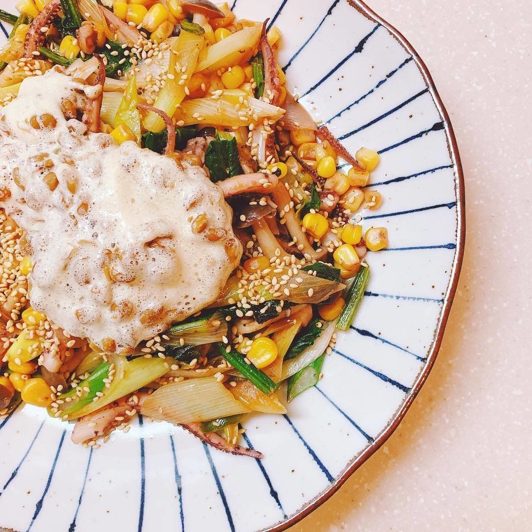 イカゲソを食べやすいサイズに、長ねぎを斜めに切ります。フライパンでイカをマヨネーズとコショウで炒めて火が通ったら、ねぎ・ほうれん草・コーン・しめじを足して炒め、コチュジャンを加えましょう。最後にいりごまと納豆をのせればできあがり。お酒にもあうので、おつまみとしてもおすすめのレシピだそうですよ。