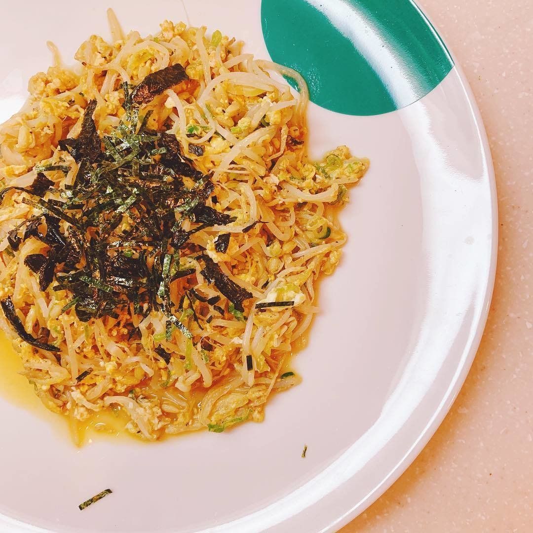 フライパンにもやしを入れ、蓋をして蒸し焼きにします。しんなりしたら刻みねぎを加えて炒め、塩コショウで味つけ。卵を入れて全体に混ざるように炒めたら、カロリー0の甘味料「ラカント」を振り、最後に市販の明太子カルボナーラソースを和えて海苔をトッピングしたら完成。めんどくさがり屋さんにもできるアイデアレシピです。