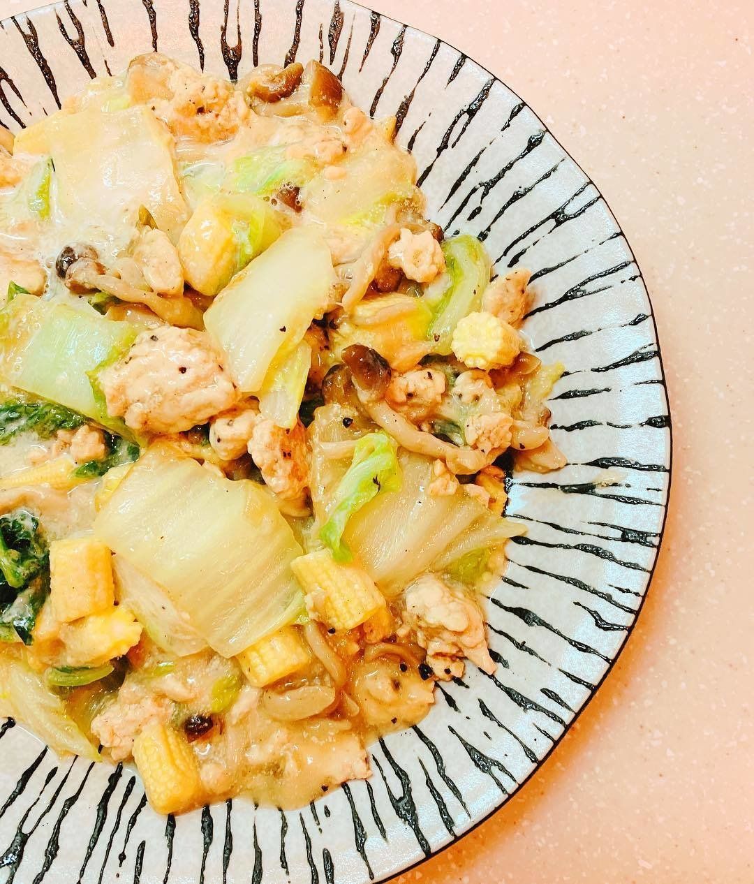 フライパンで鶏ひき肉を炒め、コショウ・中華だし・ラカントを振ります。白菜・ヤングコーン・しめじを加えて蒸し焼きにし、水を入れて煮立ったら弱火にしてとろみをつけ、さらに豆乳を入れて少し煮込んで完成です。バターの代わりにカロリー・脂肪分オフのスプレッド、とろみづけにはカロリー・糖質0のサイリウムパウダーを使用しています。