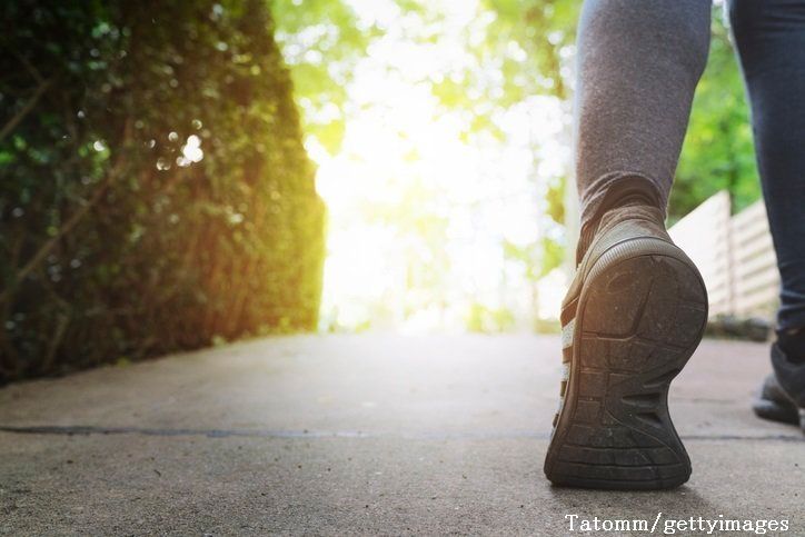 歩くときは、おへそを意識してお腹に力を入れ、背筋をしっかりと伸ばすのがポイント。ひとりで歩けるときは、大股で早歩きを意識します。スマートフォンのアプリで、歩数を自動計測しているそうです。