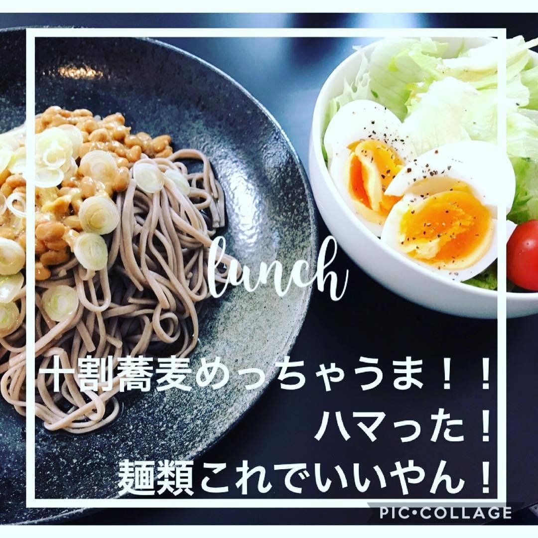 昼ごはんは、脂質や量などをあまり気にしすぎず、常識の範囲内で食べたいものを食べたいだけ食べています。この日は、はじめて十割そばをチョイス。コシがありツルツルとしているので、とてもおいしいかったとのこと。そばのトッピングには納豆をのせ、ゆで卵ののったサラダとプロテインをあわせることで、タンパク質もしっかりとっています。