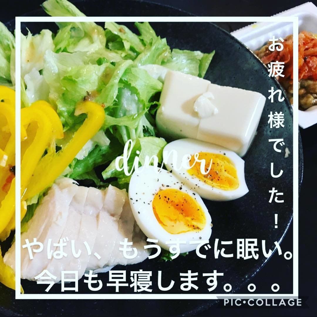 ある日の夜ごはんも、サラダと冷ややっこ、ゆで卵、サラダチキン、キムチ納豆とタンパク質中心のメニュー。キムチにはごま油をかけると、おいしさが倍増するそうですよ。食事前には、フォームローラーや足パカ、スクワットなどのトレーニングを40分ほどおこないました。