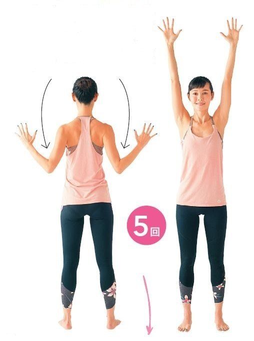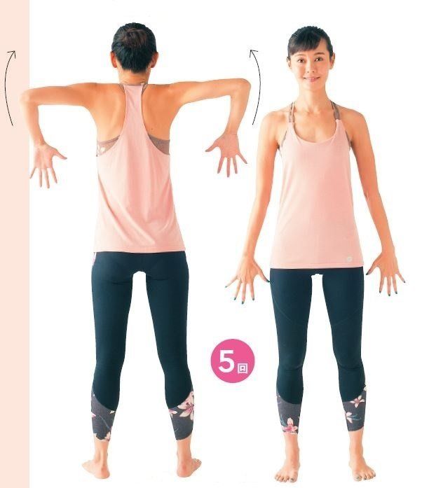 肩甲骨をぐるぐると回し、褐色脂肪細胞をしっかり刺激。さらに、ふだん動かさない体の側面をしっかり伸ばすので、お肉が落ちにくいわき腹のラインがスッキリします。