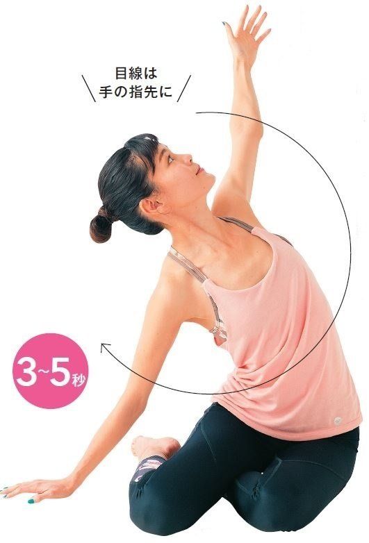 背すじを伸ばし、息を吸いながら床に い人はあぐらをかいてOK。ついていないほうの腕を大きく上げる。吐きながら気持ちよく体を横に倒す