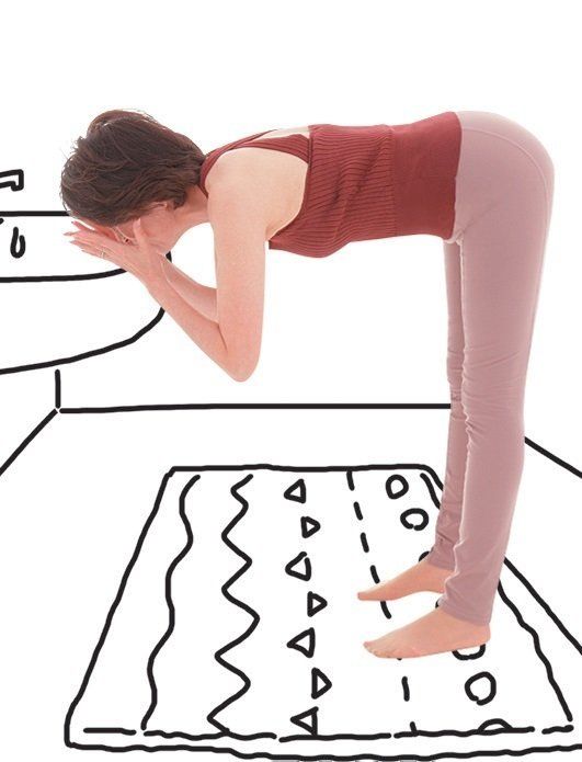 足を腰幅に開き、いつもより1歩下がって洗顔するだけ。このとき、ひざが曲がらないように