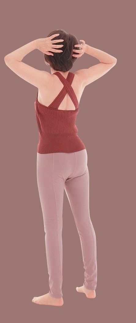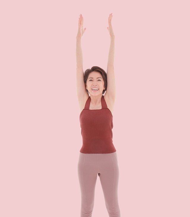 〝足のつけ根からが腕〞とイメージして、腕を真っすぐ上へ。そのときに「伸びる伸びる」と声をかけながらやると、思った以上に伸びます。丸まった猫背の改善に!