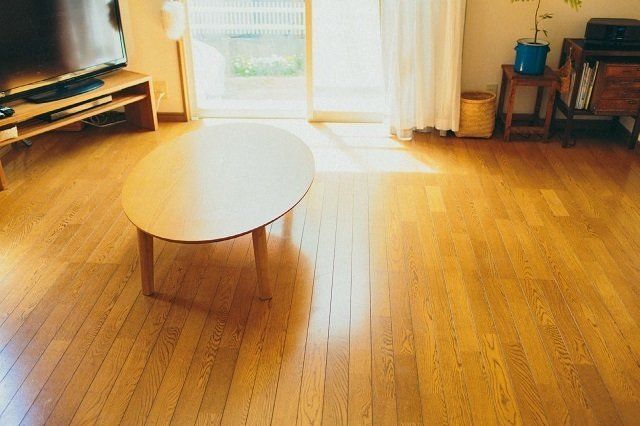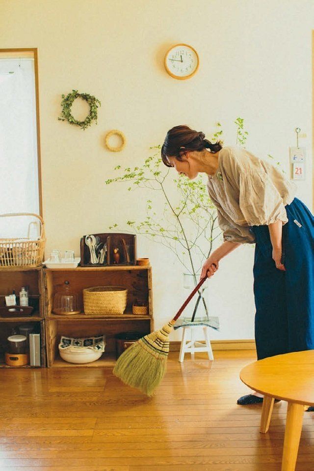 仕上げにリビングと和室をほうきで掃きます。「大きな音が出ないから、時間帯を選びません。掃除機を使うより目線が低くなるので、テーブルの下のゴミもよく見えるんです」