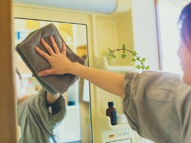 お風呂上がりに洗面所のタオルも交換するので、そのついでに鏡と洗面台をサッとひと拭き。そのまま洗濯機へ投げ込むだけだから、ぞうきんいらず。洗面所は常にピカピカです。