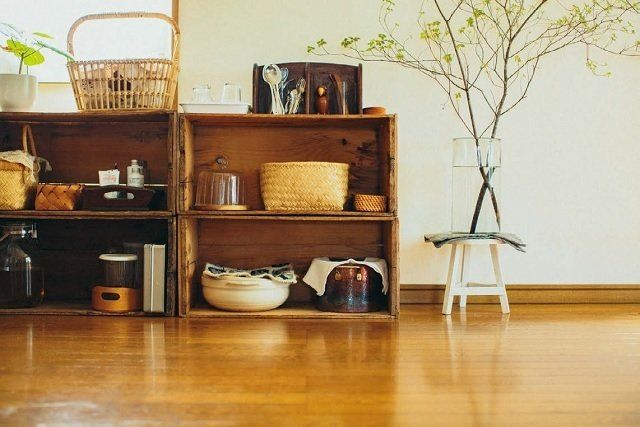 りんごの木箱を重ねて棚代わりに。ここには毎日使う食器やカトラリーを収納。子どもの手が