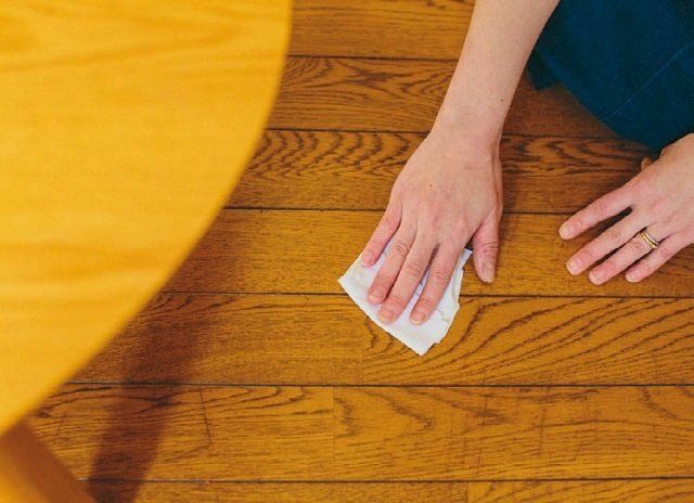 手入れが面倒なふきんはやめて、古着を小さくカットしたウエスを常備。テーブルの上や側面を拭き取り、最後に床を拭いたらゴミ箱へ。いちいち洗わなくていいから気分もラク!