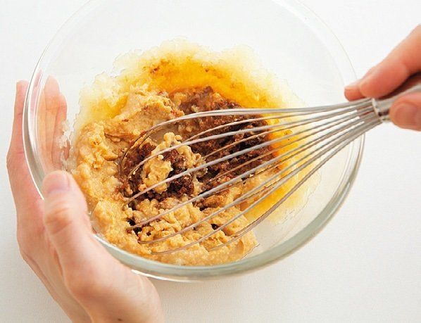 1に、赤みそ、白みそ、りんご酢を加えて泡立て器で混ぜ合わせる。最初はみそが硬いが、玉ねぎの水分ですぐになめらかになる。