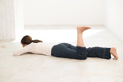 うつぶせになり、 重ねた両手の甲に顎をのせる。 両足を腰幅に開き、 左ひざを曲げる。