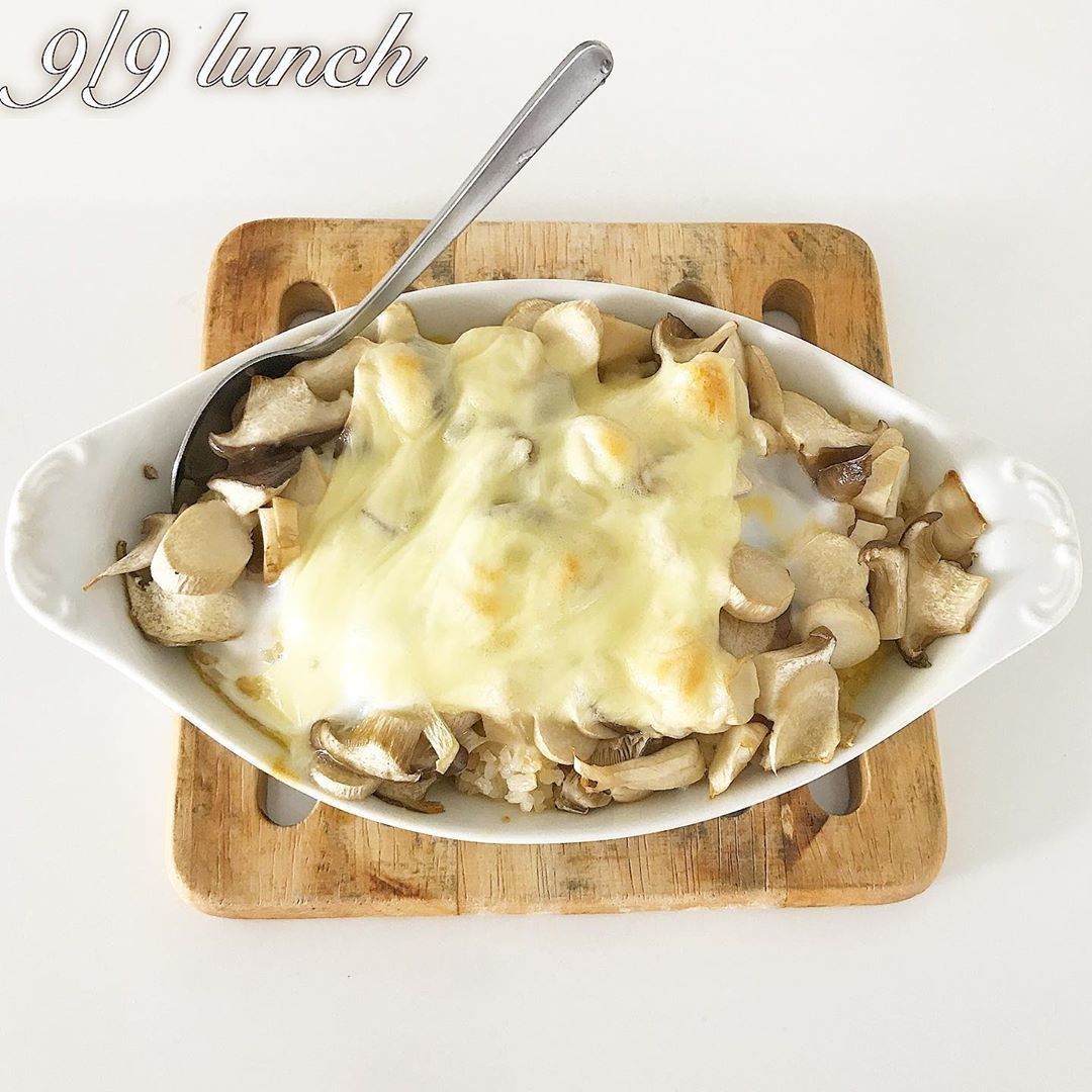 食事は、低糖質・脂質制限・高たんぱくのダイエットメニューを意識しています。こちらは、筋トレ後の昼食に冷蔵庫にある食材を使ってつくったメニュー。玄米にエリンギ・とろけるスライスチーズ・溶き卵をトッピングして、オーブンで15分くらい焼けば完成。おなかいっぱい食べても安心のメニューですね。