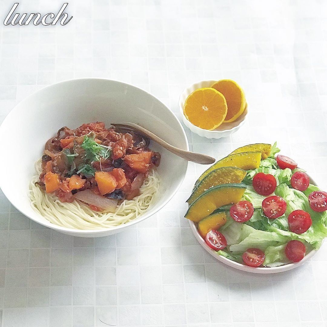 ある日の昼食には、糖質ゼロ麺をミートパスタ風にアレンジ。乱切りにしたナスやにんじんなどの野菜をオリーブオイルで炒めてから、トマトピューレで煮込んで味つけし糖質ゼロ麺に盛りつけたら完成。野菜が甘くほくほくとしていて、おいしかったのだそう。合わせて、トマトとかぼちゃをのせたサラダも食べました。