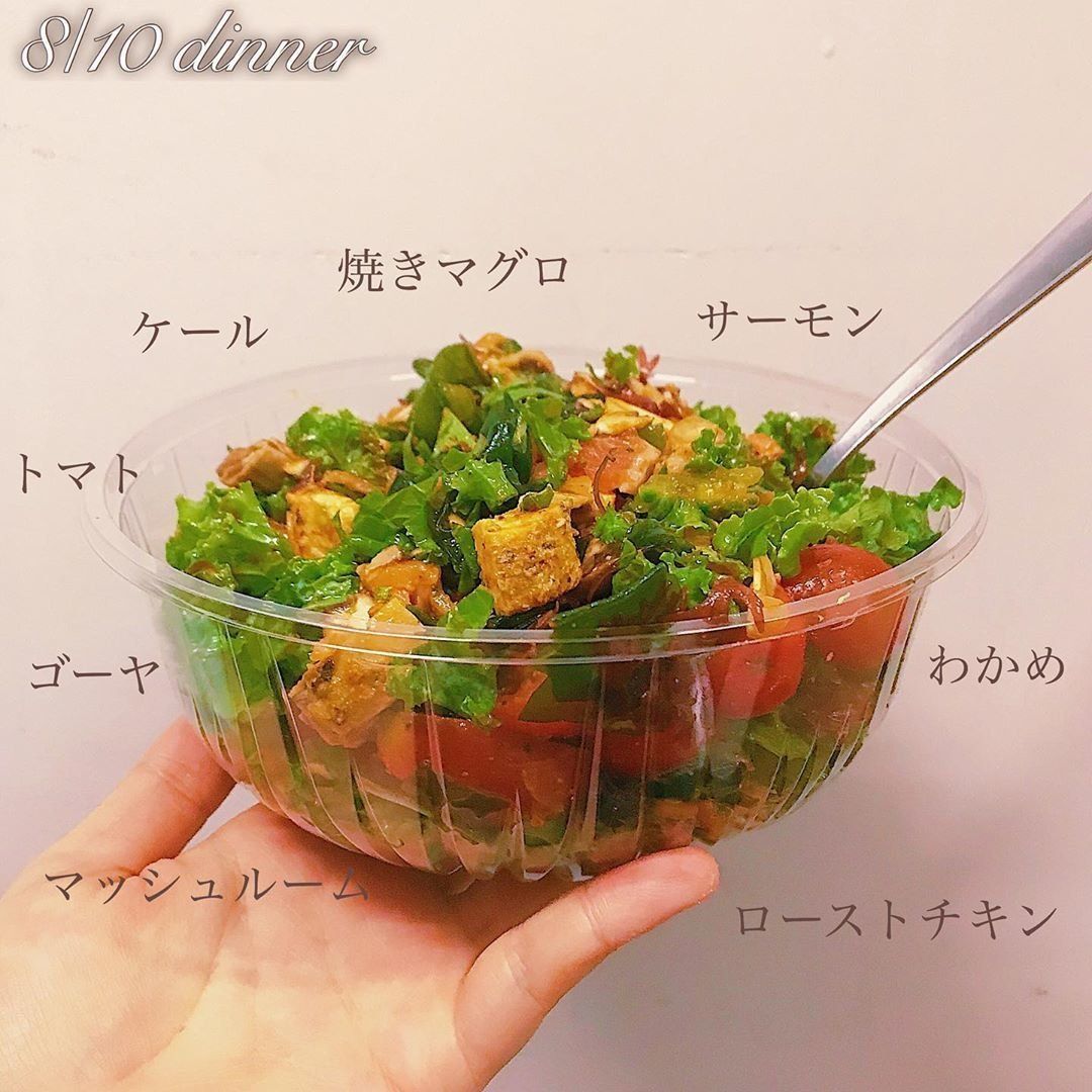 この日の夕食は、ケール・トマト・ゴーヤ・マッシュルームのサラダに、焼きマグロ・サーモン・ローストチキン・ワカメをトッピングをして食べました。また、食事をするときにはスマートフォンなどの電子機器をいじらずに、30分程度かけてゆっくりと食べることを意識。そう心がけることで、以前よりも食事の満足度がアップしたそうです。
