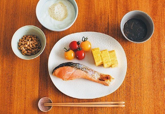 ・焼き鮭/卵焼き/トマト/納豆/ヨーグルト/もずく酢
